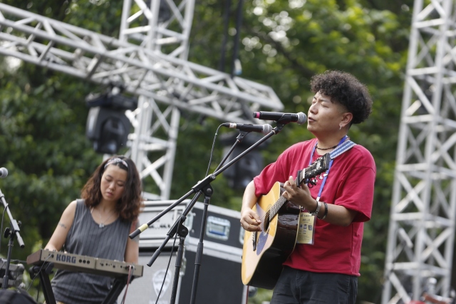 今天音乐节开场,还是30多度的高温,试试舞台的温度,第一个站上舞台的锐豆说:“我的手机在倒计时,剩下30分钟,大家可以听得下去吗?”回应他的,是齐刷刷的“能!”