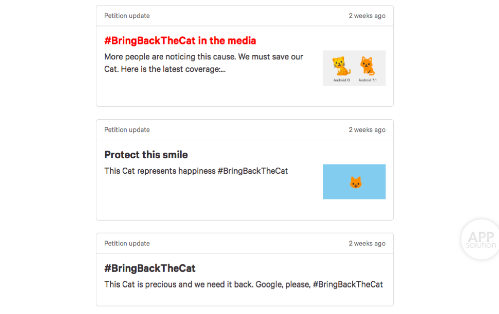为了「拯救 Android 喵」,在网上甚至还出现了 #BringBackTheCat 的话题。猫奴们表示: