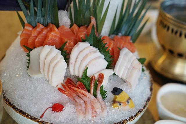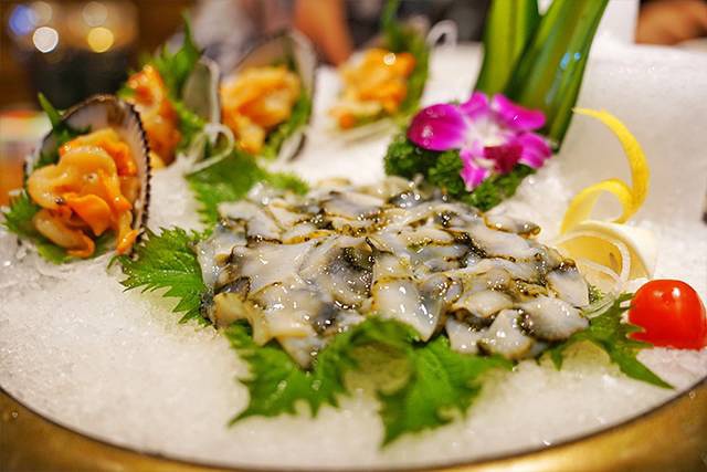 当然,这里不仅有烫煮的海鲜,刺身也是种类丰富,三文鱼、金枪鱼、北极贝、海胆通通都有,简单蘸一下酱油,就能吃出海的鲜甜来,或许这就是离海近的好处吧。