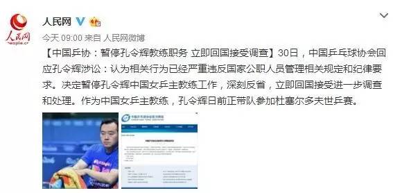 【中国乒协:暂停孔令辉教练职务 立即回国接受调查】30日,中国乒乓球协会回应孔令辉涉讼:认为相关行为已经严重违反国家公职人员管理相关规定和纪律要求。决定暂停孔令辉中国女乒主教练工作,深刻反省,立即回国接受进一步调查和处理。作为中国女乒主教练,孔令辉日前正带队参加杜塞尔多夫世乒赛。