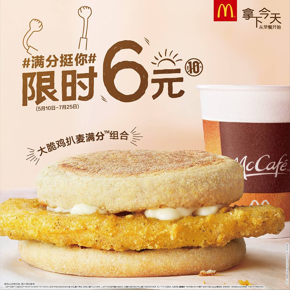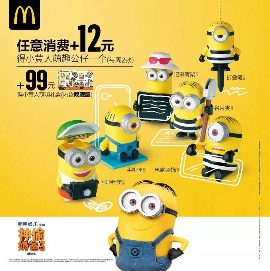 *食品和玩具以实物为准,图片仅供参考。轻松小熊系列玩具推广日期自2017年5月24日至2017年6月20日,餐厅免费玩具最低供应量为400份,送完为止。小黄人玩具推广日期自2017年5月27日至2017年7月25日,玩具共7款,其中1款为隐藏款(不单独售卖)。活动期间每周推出两款,若当周玩具售罄,下周玩具将不会提前售卖。每家餐厅小黄人公仔最低供应量为100个,售完为止。除玩具外,其它物品不在售卖范围内。那么大圆筒推广日期自2017年5月27日起至2017年6月27日止。早餐大脆鸡扒麦满分6元组合推广日期自2017年5月10日至2017年7月25日。上述产品,均只在大陆地区部分麦当劳餐厅适用,具体以麦当劳餐厅公示为准。除大脆鸡扒麦满分6元限时组合外,其余仅限早餐时段供应,早餐时段开始时间以餐厅实际情况为准,至上午10:30结束。大脆鸡扒麦满分组合限时6元早餐不适用于麦乐送送餐服务。除食物外,其他物品(包括容器,木板)不在售卖范围。