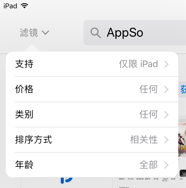 AppSo(微信公众号 AppSo)实测发现,在 App Store 的搜索结果,你还能通过类别(摄影、生活、健康……)、价格、年龄等方面进行筛选。