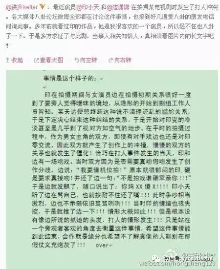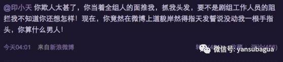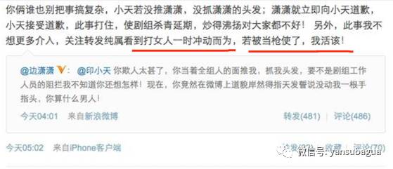 边潇潇则加码“爆料”细节,说印小天推自己、抓自己头发:「你当着全剧组的人面推我、抓我头发、要不是剧组工作人员的阻拦,我不知道你还想怎样!现在你竟然在微博上道貌岸然指天发誓说没动我一根手指头,你算什么男人!」