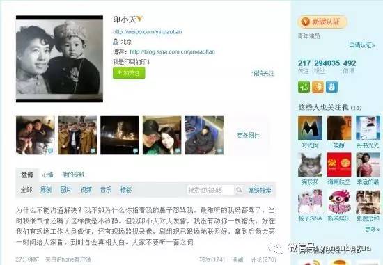 @印小天:一大早剧组要视频吃了闭门羹。我下午为要视频还报了警也没成。截图里没我,左是边,中是场务小东,右是现场老五。此时我已离场。朋友们,若是我打人剧组早就在白天让我道歉解决此事了。我打人肯定也会马上道歉的,我不傻你们更不傻。骂起来大家劝架就会产生肢体冲突。说我打人,抓她头发绝没有。……恳请能否把没有删减的完整视频,早日发出。把你说的肢体冲突,我说的之前的骂战,她说的抓她头发和打她的视频,公布与众。谢谢。
