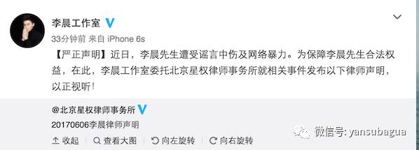 李晨那边挂了半天热搜直接发律师函了,说自己遭遇了网络暴力。