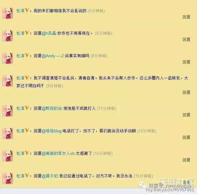尤其是,天涯网友发现,杜淳对这件事回复得特别勤,坚持说自己掌握的就是真相,称印小天泡妞不成打人了。
