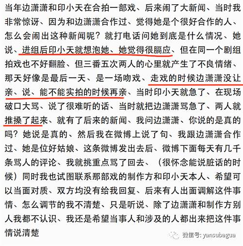 印小天和边潇潇原来有暧昧,但边潇潇单方面决定结束,拍到吻戏时边潇潇想借位,印小天想真亲,两个人吵起来了,印小天说:“不是拍戏谁稀罕亲你!”边潇潇则开始骂脏话,印小天也回骂了,但是打人、抓头发,不存在。