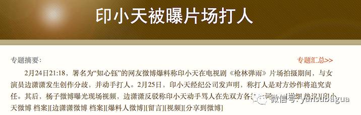 事情的起因是:微博ID为@知心钰的网友微博爆料称印小天在电视剧《枪林弹雨》拍摄期间,与女演员边潇潇发生创作分歧,并动手打人。