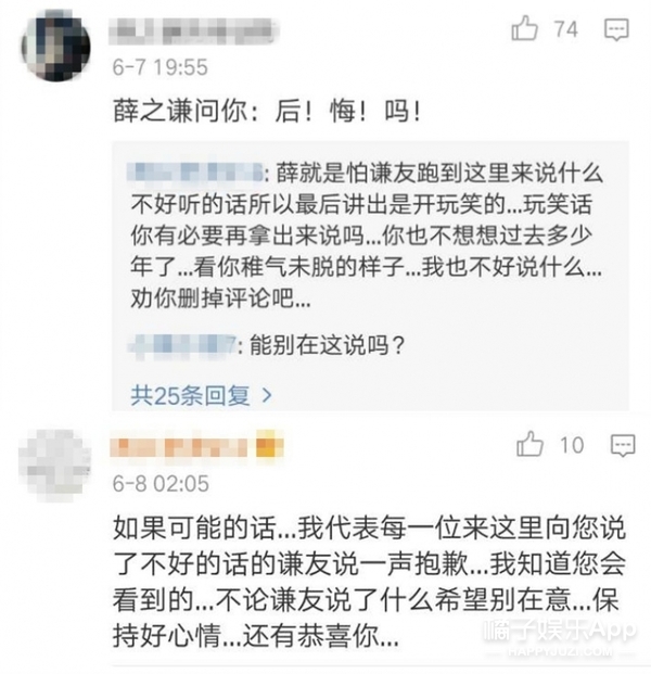 昨天有网友去章龄之的微博下面传话说:薛之谦问你后悔吗?
