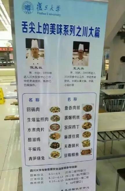 【川大派了两个食堂大厨去复旦交流……没想到火上天了!】事情是这样的,6月5日,复旦大学的学生发现食堂里面多了一个川菜窗口,窗口居然一口气提供了12道菜!川大美食随之迅速征服了复旦学子的胃。复旦的票圈被川大的美味菜肴刷屏了,食堂的川菜窗口更是人满为患,不仅刚出锅的菜几秒就被抢光,还有人天天去蹲点...