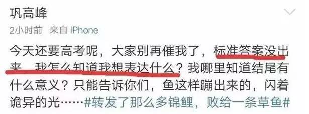 据考生们介绍,这两道题,“前一道6分,后一道5分,我估计我加起来都拿不了5分。”既然遇到如此“惨无人道”的题,那自然就会想到去找文章作者要标准答案,至少要看看自己败在哪里。就这样,文章原作者@巩高峰 被挖出,他竟然也解释不了....
