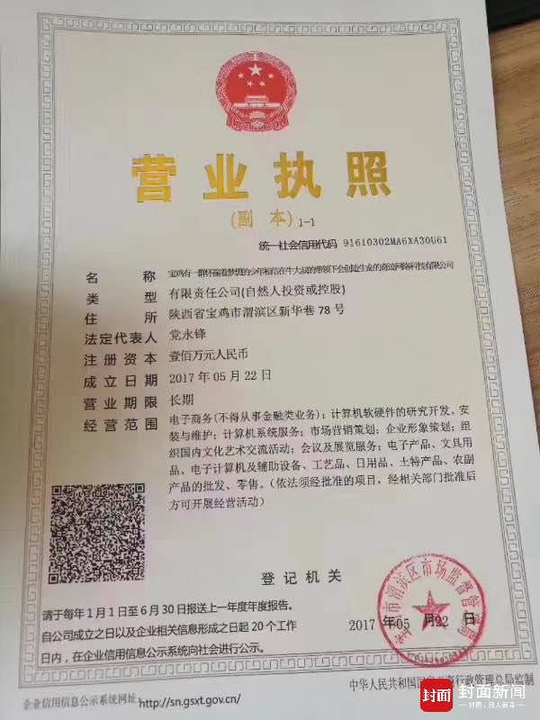 工商资料显示,该公司注册资本为100万元人民币,地址在陕西省宝鸡市渭滨区。公司经营范围包括电子商务(不得从事金融类业务);计算机软硬件的研究开发、安装与维护;市场营销策划;会议及展览服务;电子产品、文具用品、电子计算机及辅助设备、工艺品、日用品、土特产品、农副产品的批发、零售等。