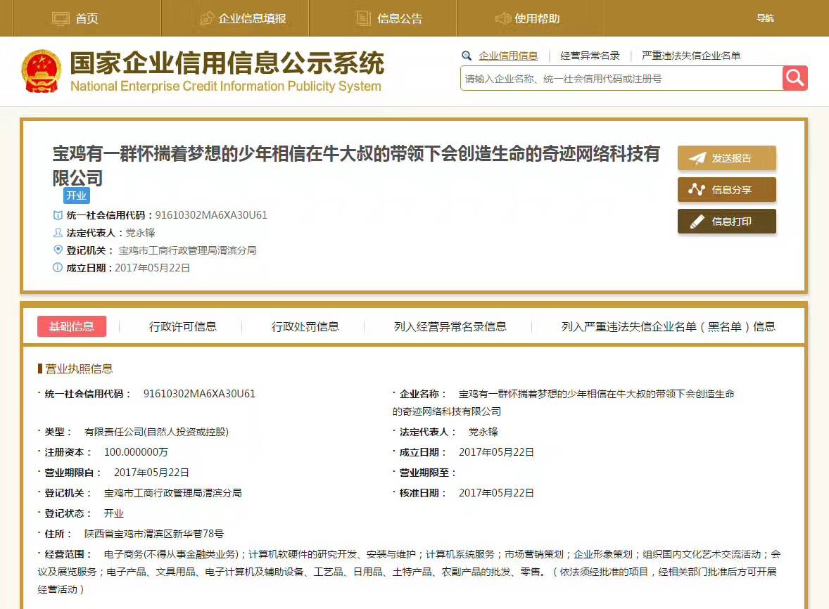 本报记者登录国家企业信用信息公示系统查询发现,这家被网友称为“最长名称公司”,还真的有。注册名称确实为“宝鸡有一群怀揣着梦想的少年相信在牛大叔的带领下会创造生命的奇迹网络科技有限公司”,显示成立日期为2017年5月22日,时间还不到1个月。