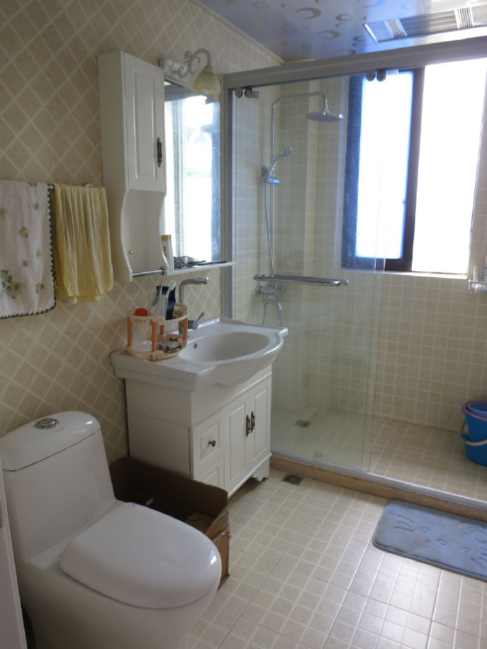 ▼卫生间,空间看起来还是比较宽阔的,成品的浴室柜及浴室镜同样也是宜家款;