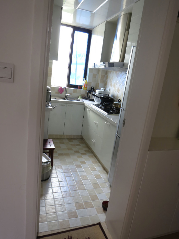 ▼厨房,墙面及地面都是采用小块的彩色砖,白色的橱柜,让这个厨房显得既干净、明亮又带有一股俏皮的味道;