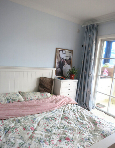 ▼卧室,背景墙刷了天蓝色漆,同时也搭配蓝色碎花窗帘,家具上则选购的是白色的床及床头柜,配上白色底花卉图案的床被,营造出一种舒适、清新、自由的感觉;
