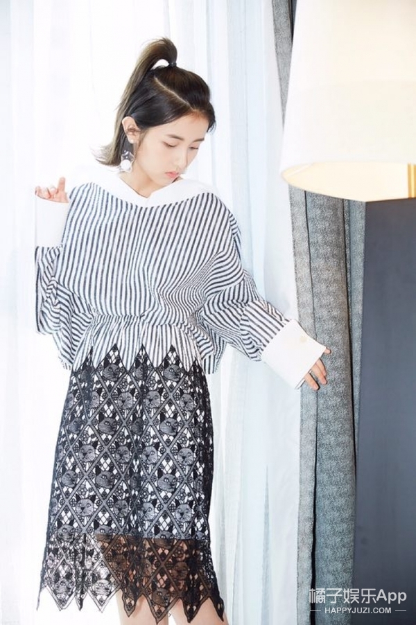 身穿简单竖条上衣搭配黑白蕾丝半裙~上衣和半身裙都是来自品牌DAWEI,上衣的竖条纹和三角形的剪裁设计都非常具有时尚感!