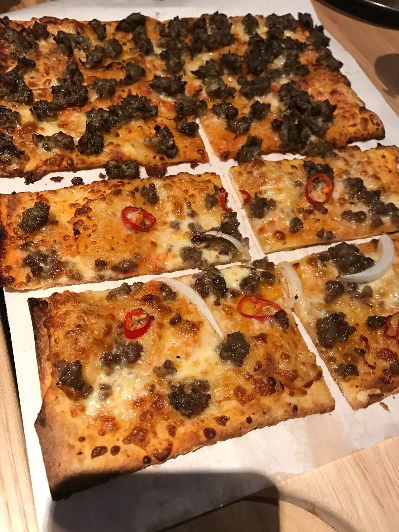 本来以为这么时髦的店铺主要的客人会面向“小年轻”,却发现这里也有宝宝椅。薄饼在菜单上介绍说是法国米其林三星厨师的创意美食,饼底厚度只有2毫米。当时只点了梅干菜肉沫儿的薄饼——因为有优惠活动,结果口味惊艳到我了,让我想起以前去乌镇吃到的梅干菜烙饼,肉沫儿不油腻,饼酥酥脆脆,咬一口嘴里香喷喷的,特别好吃。火龙果凤梨汁装在夸张的大杯子里,浓浓的果味儿很过瘾。