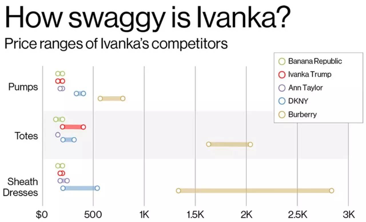 伊万卡·特朗普品牌到底有多大众化?彭博汇总了伊万卡品牌的定价数据,并与其他主打职场服饰的品牌进行了比较,以三种职场必备单品为例:高跟鞋、托特包和紧身连衣裙。伊万卡长期以来一直宣传自家产品是职业女性买得起的职场服饰。伊万卡·特朗普的商标现在跟商场常见的香蕉共和国(Banana Republic)和Ann Taylor品牌挨在一起,而这些品牌根本不是奢侈品。