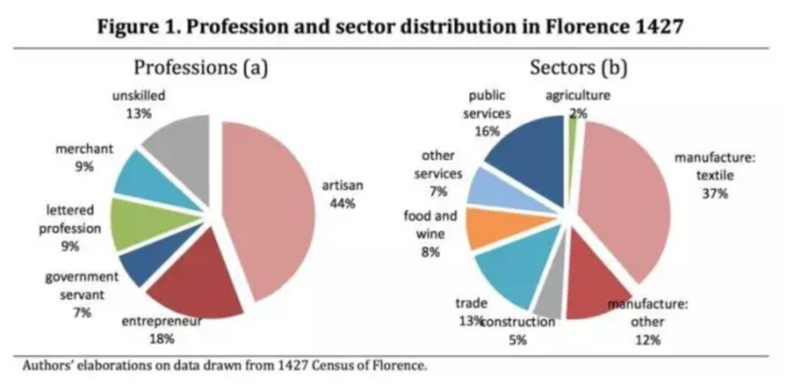 1427 年,佛罗伦萨人的职业和行业分布情况。工匠(artisan) 占总人数的 44%。人口从业比例没有变化,社会是静止的,600年来变化很小。 图片来自:意大利银行