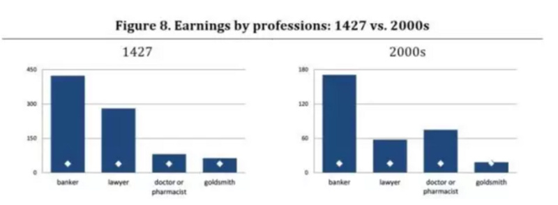 不同职业的收入比较,1427 年 VS 2000 年代。600年了,银行家、律师、始终属于高收入阶层。医生的收入有所提高。图片来自:意大利银行