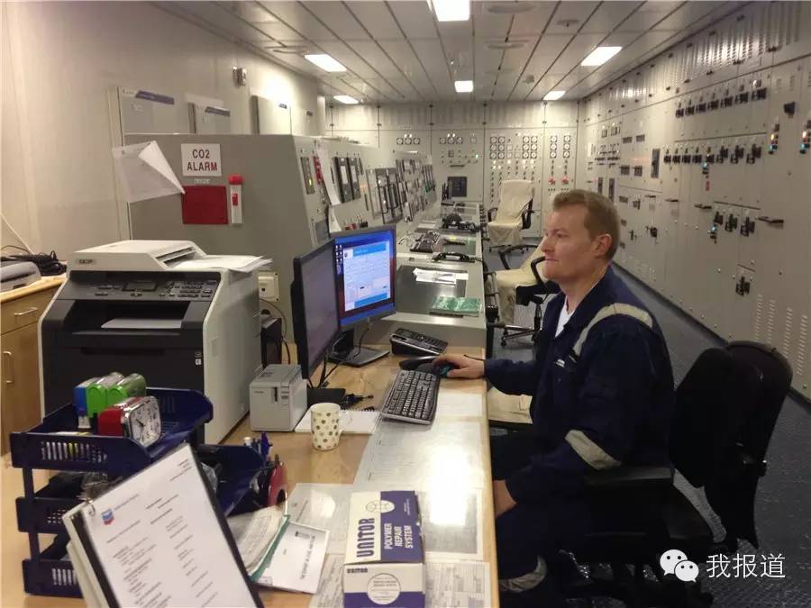 图为“美腾号”的轮机长在工作,从这里可以监控船舶发动机。