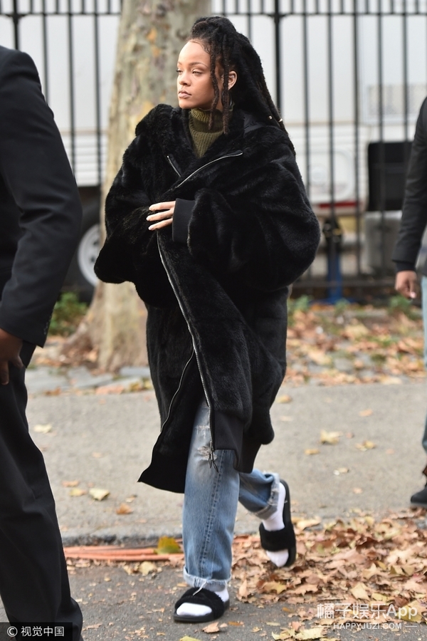 作为Puma的干女儿,蕾哈娜街拍中出镜最多的就是Puma家的带毛拖了。
