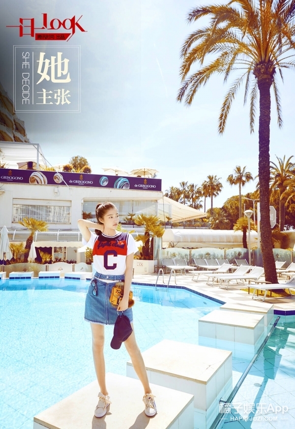充满运动风的短袖T下搭牛仔拼接带短裙,再用泳池做背景,透漏着沙滩宝贝的活力,但整体穿搭又显得十分休闲日常。