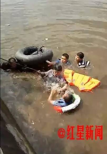 老人上岸后,杨立冬、韩瑜两人扶着群众丢下的一只大轮胎,随着水流漂了20多米才挣扎上岸。
