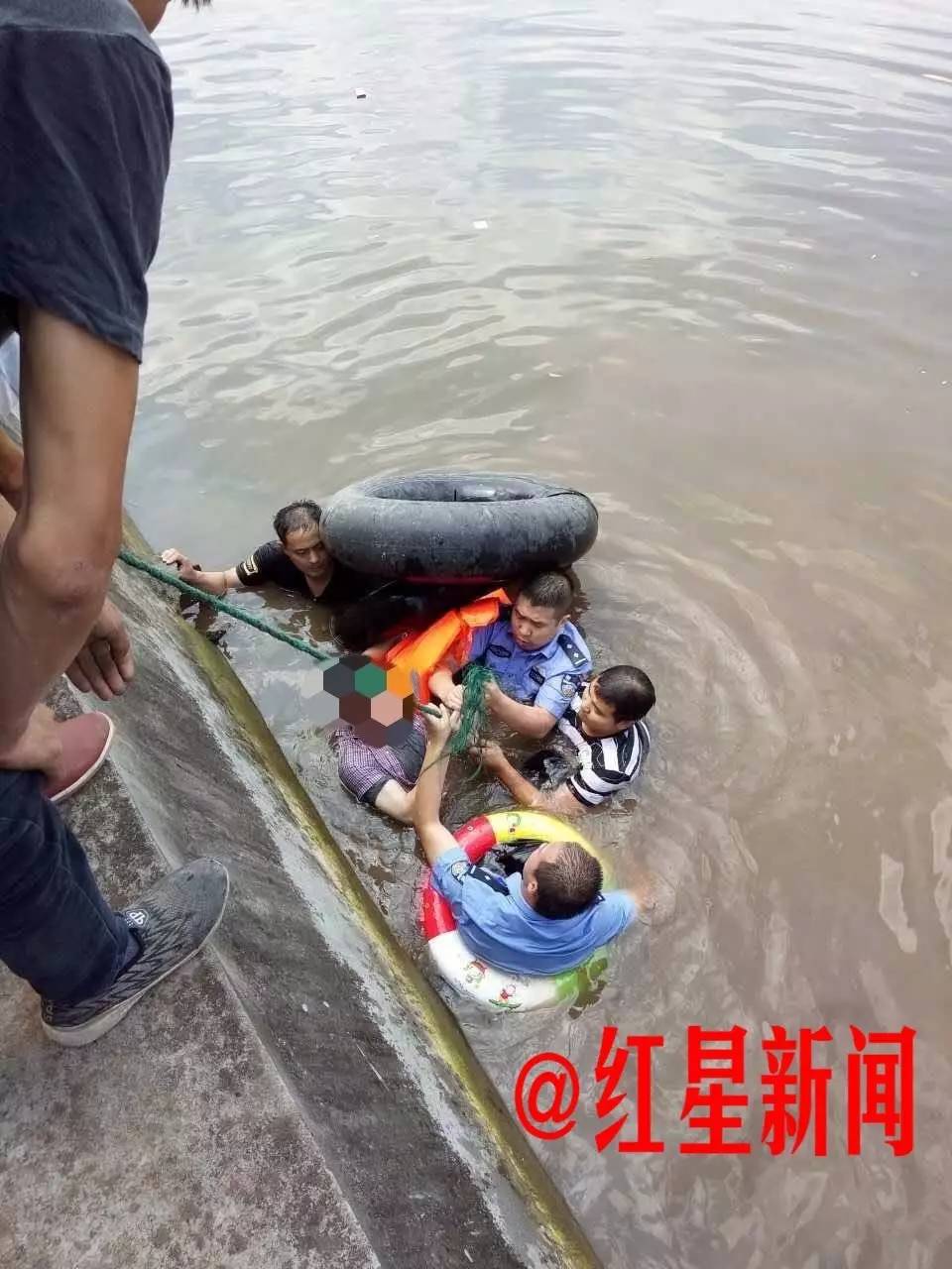水中无处借力,生死一线,幸好在龙马派出所教导员杨先锋和群众的帮助下,自杀老人被拉上了河岸。而筋疲力尽的杨立冬、韩瑜两人扶着群众丢下的一只大轮胎,随着水流漂了20多米才挣扎上岸。