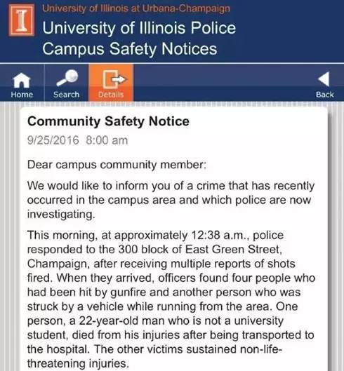 去年9月25日,UIUC所在的城市曾接连发生两起枪击事件,至少造成1人死亡、5人受伤,其中一起枪击案就发生在校园内。