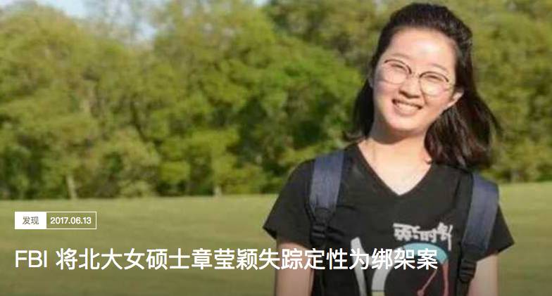 美国联邦调查局(FBI)14日宣布,正式将中国访问学者章莹颖失踪事件定性为绑架案。