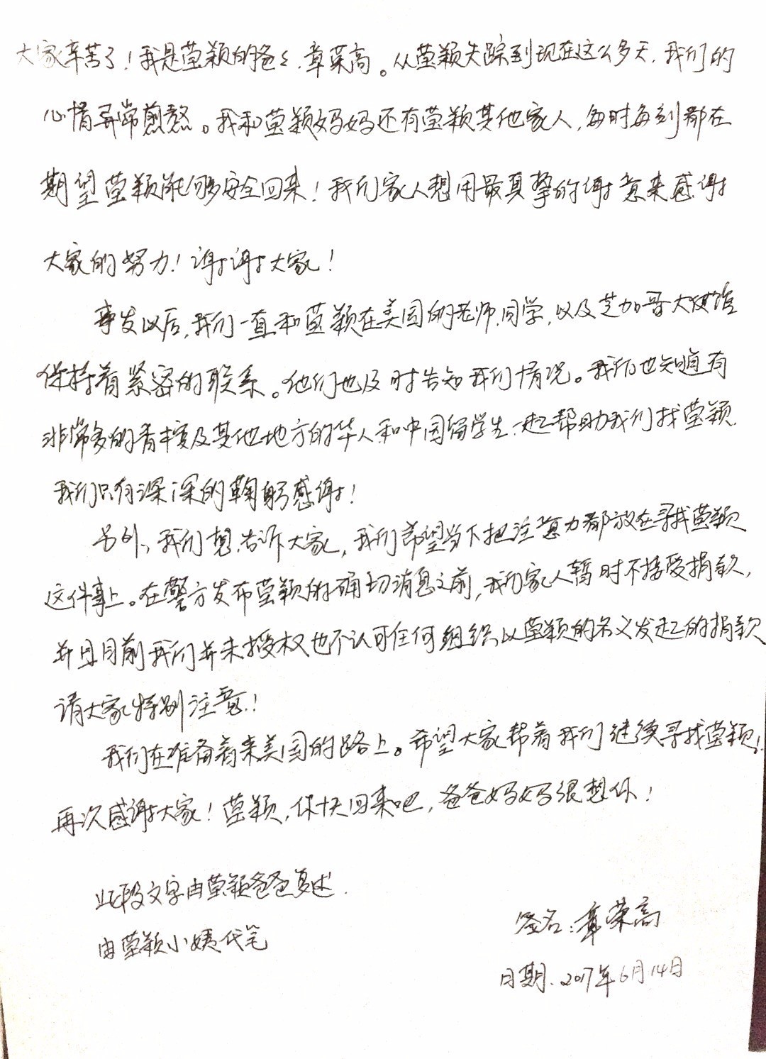 据国内媒体此前报道,章父委托媒体发布公开信,希望大家把关注点集中在找人,暂不接受捐款: