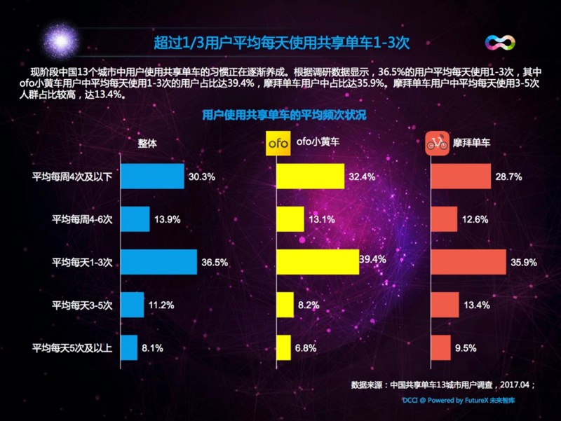 用户调研数据显示,36.5%的用户平均每天使用共享单车1-3次,其中 ofo用户中平均每天使用1-3次的用户占比达39.4%,摩拜单车用户中占比达35.9%。