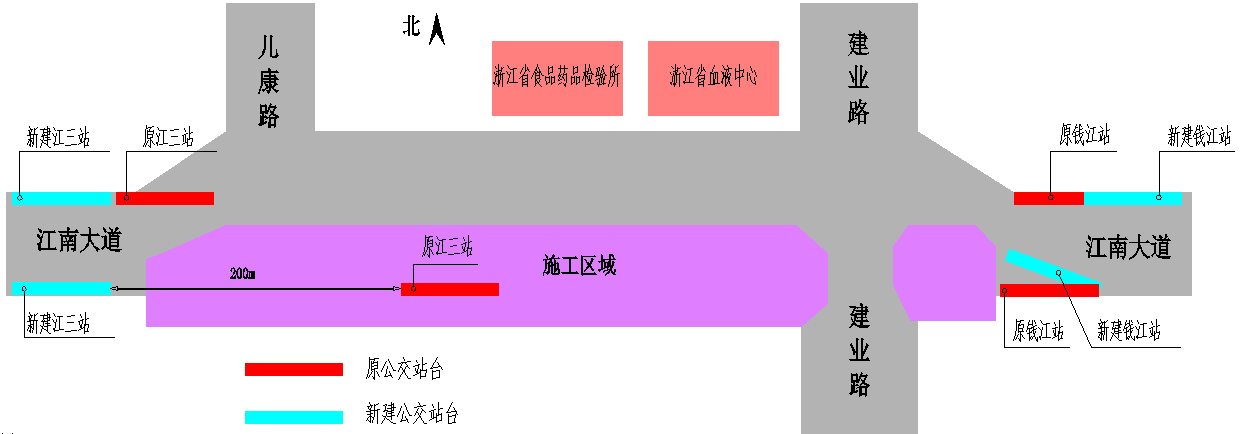 公交站调整因建业路站施工需要,公交江三站和钱江站站台位置需作调整:南侧公交江三站站台向西移动200米;北侧江三站站台向西移动50米;北侧钱江站站台向东移动24米,处于人行道处;南侧钱江站站台随道路线性进行微调。公交线路不做调整。