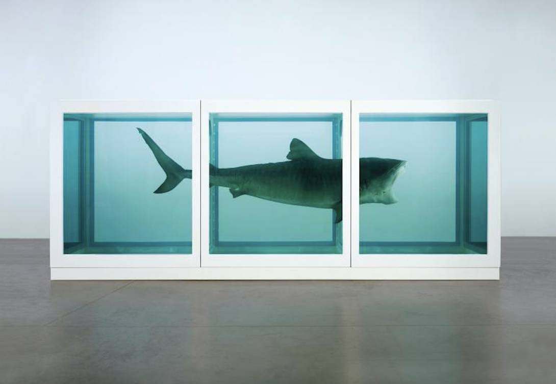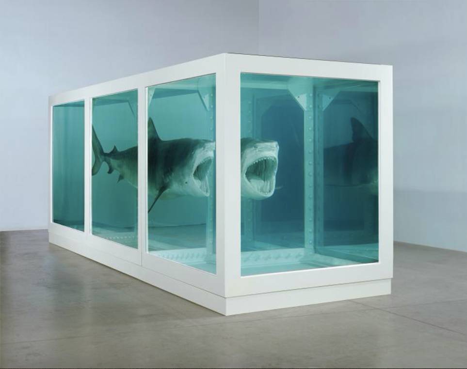 14 英尺长的虎鲨保存在甲醛里,以 1200 万美元出售,这件作品巩固 Damien Hirst 的艺术地位,但也引起一波关于作品价值与独创性的争议。因为即使虎鲨是保存在甲醛中,却也会随着时间遭受磨损和退化,并不能真正冻结时间。二来这件作品并非他本人亲自动手做成,而是由他的团队。即使如此多意见,不可否认地,当我们看著鲨鱼,它似同时死亡、同时活著——虽然事实上它是死的,但它成了一种令人不安的存在。