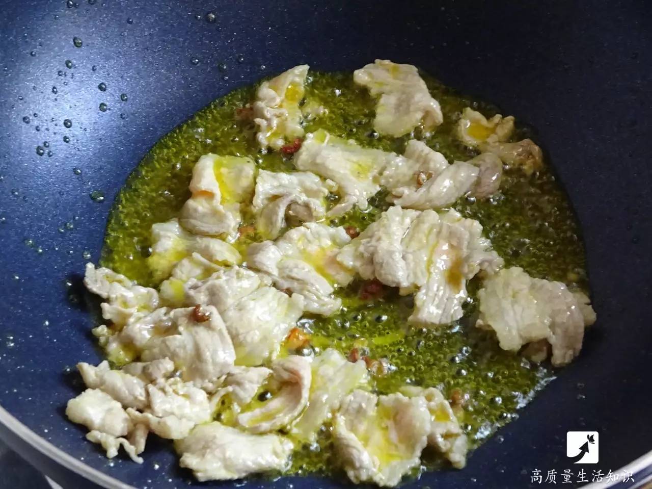 将腌好的五花肉片下锅炒至变色