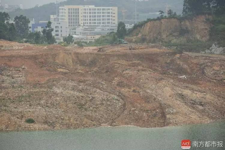 采石场矿坑与金地上城相对的另一侧,大型机械正在平整土地。