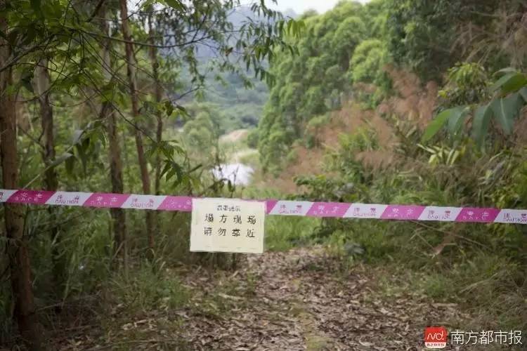 小区外的山路上拉了警戒线,提示前方滑坡。