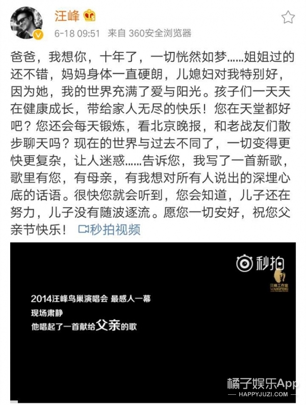 相比之下,汪峰的父亲节感言就有点心酸了,原来汪爸十年前就去世了,2014年,在演唱会上,汪峰还为在天堂的爸爸唱了一首歌,现场十分感人。