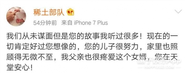 章子怡也转发了汪峰的微博,对未曾谋面的公公说“您的儿子很努力,家里也照顾的无微不至,我父亲也很疼爱这个女婿,您在天堂安心!”