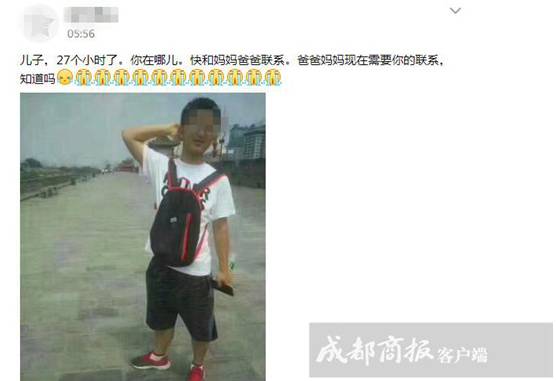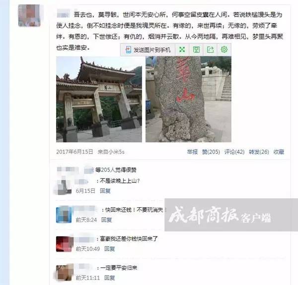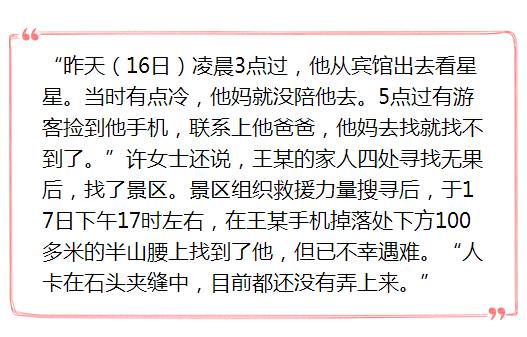 据6月16日在网络上发布的寻人信息,王某今年17岁,内江人,6月16日凌晨3点从华山东峰宾馆独自出发,到距离不远的景点看星星,随后与家人失去联系。当天早晨5点50分许,有游客在华山论剑景点处拾得王某的手机,然后通过该手机与王某的父亲取得联系。