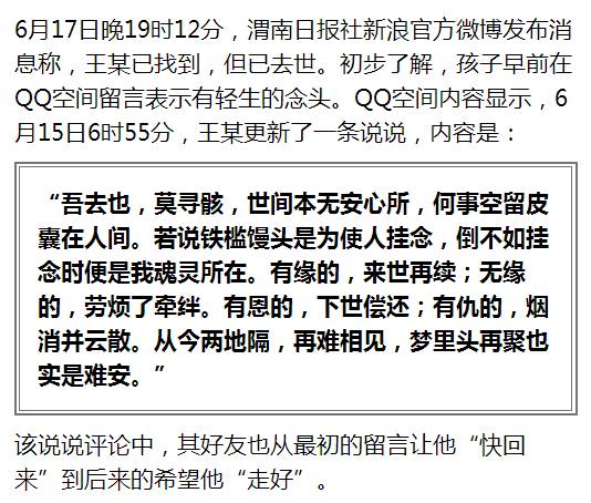 四川17岁男孩王某刚刚结束高考,随母亲到华山旅游,却在6月16日凌晨去观景点看星星后失去联系。景区当地救援力量搜寻后,于17日下午在华山半山腰的石缝中找到了他,但已不幸遇难。据渭南日报社消息,初步了解,王某早前在QQ空间留言表示有轻生的念头。