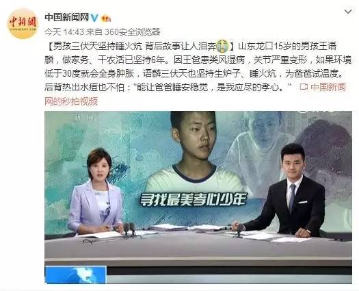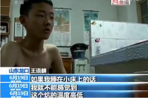 【男孩三伏天坚持睡火炕 背后故事让人泪奔】山东龙口15岁的男孩王语麟,做家务、干农活已坚持6年。因王爸患类风湿病,关节严重变形,如果环境低于30度就会全身肿胀,语麟三伏天也坚持生炉子、睡火炕,为爸爸试温度。后背热出水痘也不怕:"能让爸爸睡安稳觉,是我应尽的孝心。"