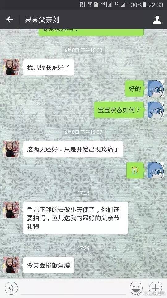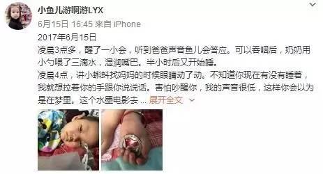 @ZJK的butterfly:鱼儿努力挣扎就是想陪爸爸过一个父亲节,真是懂事孝顺的乖鱼儿!鱼儿选择鱼儿爸妈做父母,鱼儿爸妈选择鱼儿做宝贝,是你们彼此最珍贵的回忆!鱼儿现在走了,留下了最美的眼角膜,棒棒哒!希望鱼儿爸妈,叫你们一声哥哥姐姐,你们一定要振作,相信鱼儿也会看着你们过得比现在幸福,望各自珍重!