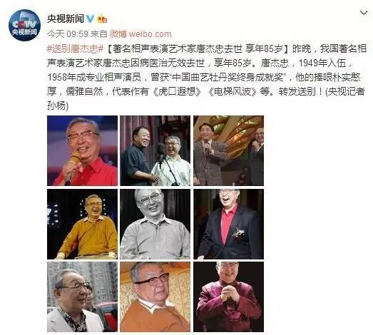 【著名相声表演艺术家唐杰忠去世 享年85岁】昨晚,我国著名相声表演艺术家唐杰忠因病医治无效去世,享年85岁。唐杰忠,1949年入伍,1958年成专业相声演员,曾获“中国曲艺牡丹奖终身成就奖”,他的捧哏朴实憨厚,儒雅自然,代表作有《虎口遐想》《电梯风波》等。转发送别!(央视记者孙杨)