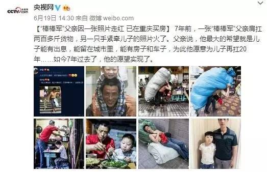 【“棒棒军”父亲因一张照片走红 已在重庆买房】 7年前,一张“棒棒军”父亲肩扛两百多斤货物,另一只手紧牵儿子的照片火了。父亲说,他最大的希望就是儿子能有出息,能留在城市里,能有房子和车子,为此他愿意为儿子再扛20年……如今7年过去了,他的愿望实现了。