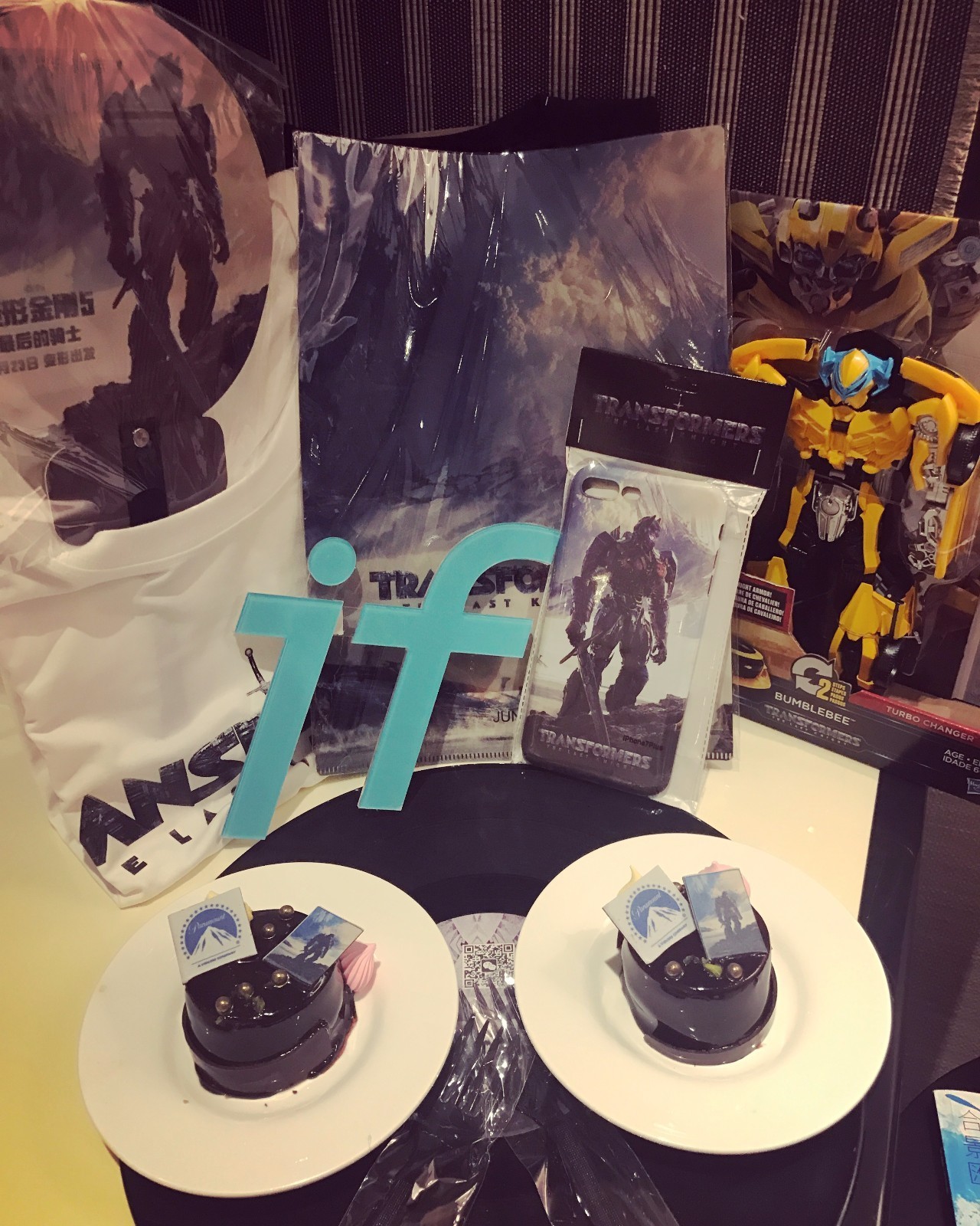 大黄蜂汽车模型,擎天柱手机壳、文件夹、扇子,两件《变5》主题T恤,还有两块巧克力主题蛋糕~