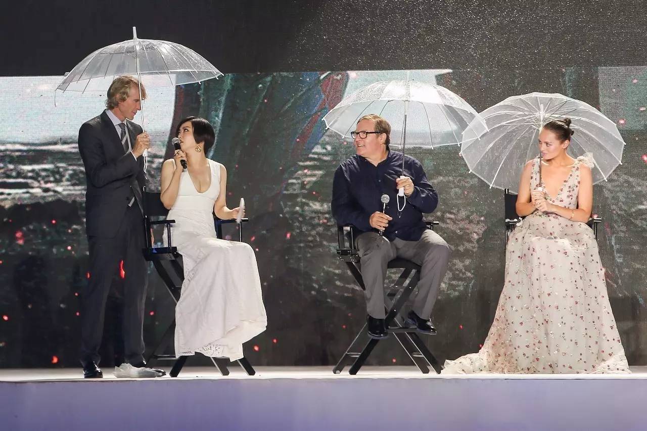 当其他人忙着打伞的时候,迈克尔·贝起身走到了主持人查可欣身边,非常绅士地为她撑伞。(原来铁血导演,也有这么暖的一面)