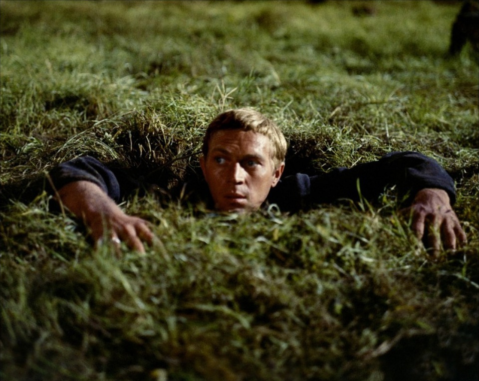 卡司阵容极其奢华的《大逃亡》(1963)从各方面而言,都是一部最纯正的主旋律战俘营越狱片。史蒂夫·麦奎因饰演的主人公希尔,从被关进战俘营的第一天就开始筹划越狱,但就像麦奎因后来饰演的亨利·查理尔一样,十多次尝试皆无功而返。屡败屡战的他,意识到必须与同伴分工协作,才可能逃离看管严密的战俘营。于是,一项浩大的挖地道工程在战俘营中秘密进行,三条地道同时开挖,几十名战俘各司其职,有人负责把军服改成便装,有人负责处理地道里的渣土,有人负责伪造身份证件和火车票,堪称一个严密的逃亡系统。最终,希尔终于越狱成功,他抢下一辆德军摩托车,飞驰在乡间小路上的结尾一幕,成了影史经典镜头。但就在他即将冲过瑞士边界线的时候,还是被德军逮了回去,继续斗志昂扬地关禁闭。